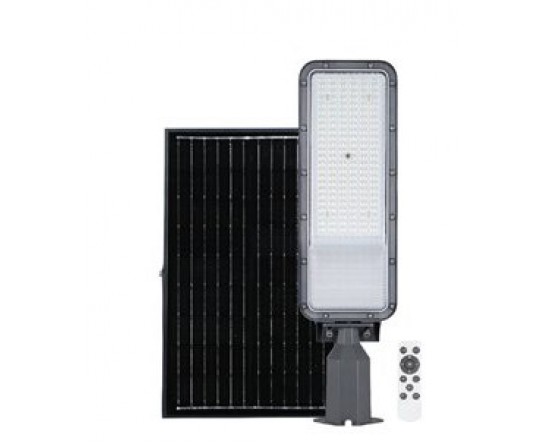 Luminária pública solar LED Longbia 8W, cinza, 4000K, 1400 lúmens, Ø60 mm. Material de alumínio/PC, sensor de movimento/crepúsculo, alcance de 8 m, bateria LiFePO4, autonomia de 12 h, IP65, embalagem em caixa.