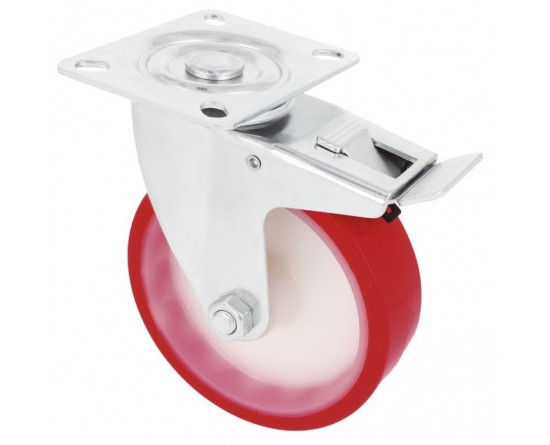 Roda de plástico. Com placa e travão. Banda de poliuretano vermelho. Núcleo de nylon branco. Projetadas para cargas pesadas.
